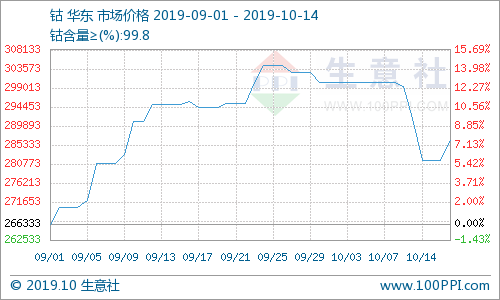 中國粉體網訊 根據生意社數據監測顯示:節后國內鈷價大幅下跌。截止10月14日,鈷價報價286500.00元/噸,較10月1日鈷價報價均價300333.34元/噸下跌,跌幅4.61%。9月新能源汽車表現不佳,引發鈷市恐慌,鈷價下跌。