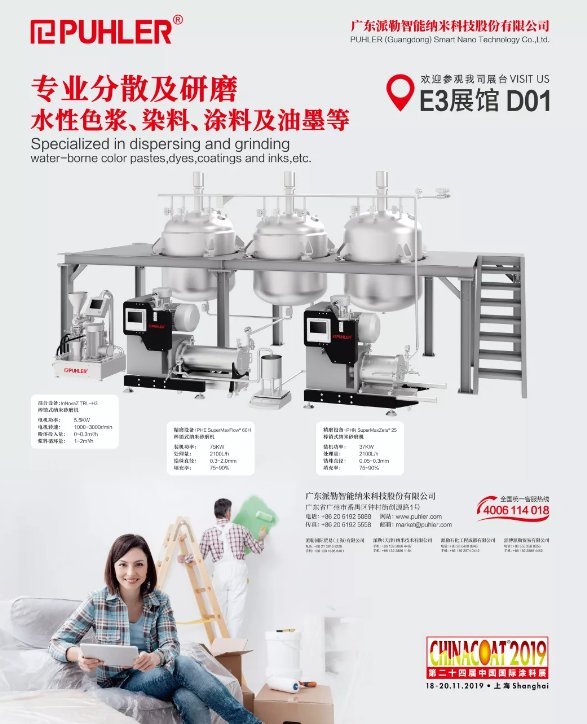 Chinacoat 2019第24屆中國國際涂料展定于2019年11月18-20日在上海市浦東上海新國際博覽中心舉行。廣東派勒智能納米科技股份有限公司攜納米砂磨機亮相展會,派勒智能誠邀您共同參加。