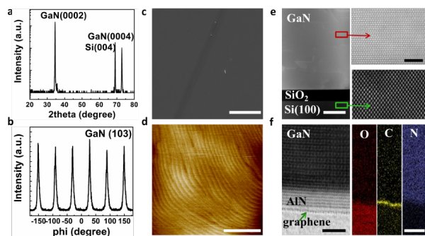 沈波和楊學林課題組創造性地使用單晶石墨烯作為緩沖層,在Si(100)襯底上實現了單晶GaN薄膜的外延生長,并系統研究了石墨烯上GaN外延的成核機理和外延機制。該突破不僅為GaN器件與Si器件的集成奠定了科學基礎,而且對當前國際上關注的非晶襯底上氮化物半導體外延生長和GaN基柔性器件研制具有重要的指導價值。