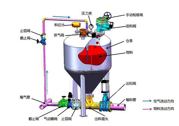 氣力輸送系統(tǒng)分為壓送式、吸送式以及混合式。不管哪種方式的氣力輸送系統(tǒng)都是由鼓風(fēng)機(jī)、供料裝置、輸送管道、分離器、除塵器等幾個基本結(jié)構(gòu)組成。其原理是物料經(jīng)供料斗進(jìn)入倉內(nèi),一定高度時,關(guān)閉進(jìn)料閥,此時壓縮空氣由進(jìn)氣閥進(jìn)入倉泵,使料和氣混合形成料和氣流,再打開出料閥,料和氣流就可以經(jīng)輸送管道送到儲料庫。