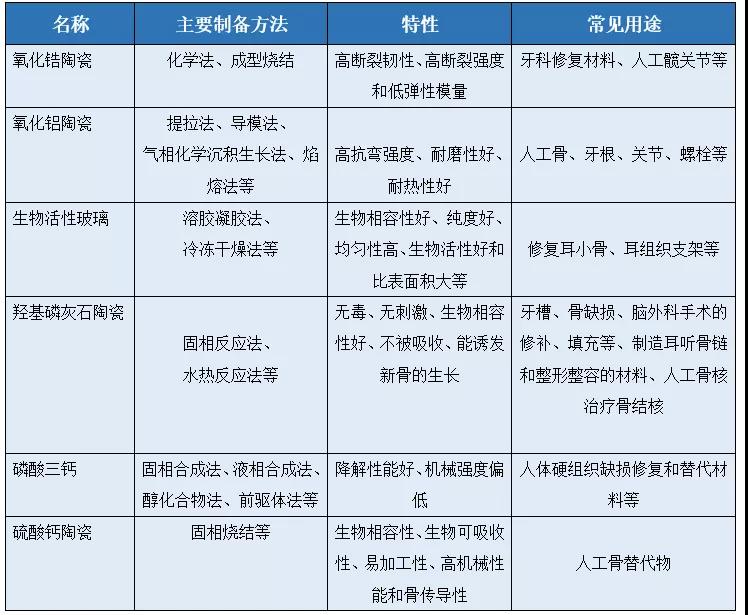 常見(jiàn)生物陶瓷主要制備方法、特性及常見(jiàn)用途