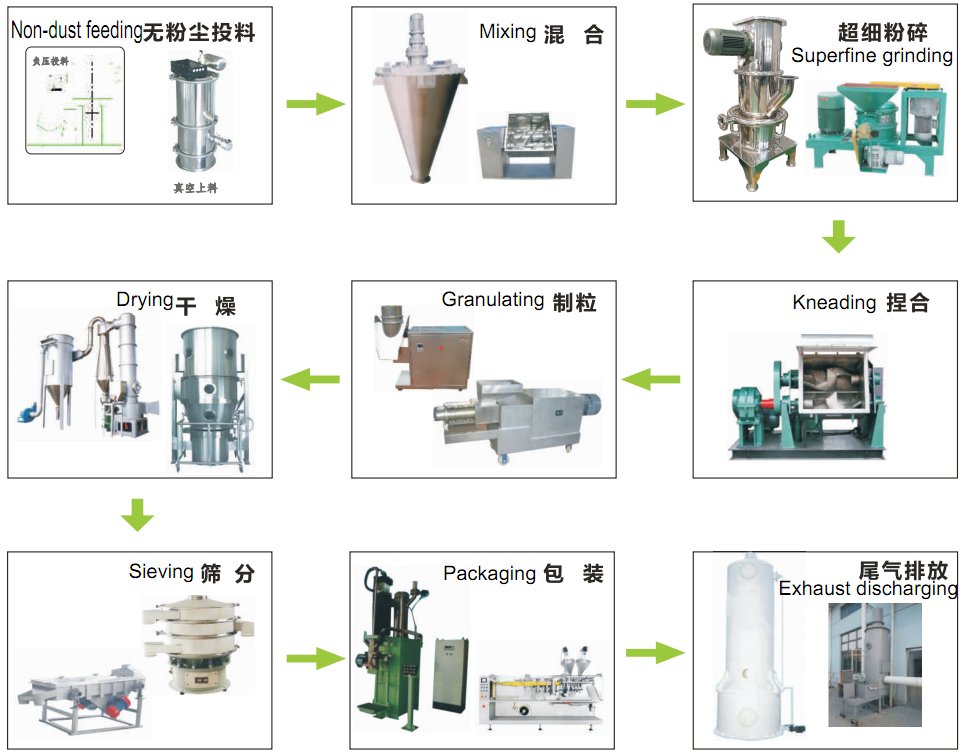 粒型可濕性粉劑(又稱水分散粒劑或干懸浮劑),其原料為可濕性粉劑通過制粒而形成的一旦放入水中,能較快的崩解。分散,形成高懸浮的固液分散體系的粒狀制劑。造粒操作單元是整套工藝的核心。造粒機是確定農藥造粒,干燥工藝流程配置的關鍵,依據農藥的特性,實驗數據及工程應用實例,選用旋轉擠壓造粒機或雙螺桿擠出造粒機(傳動軸部分加冷卻水系統)或螺桿造粒機(造粒腔體部分加冷卻水系統)或流化床造粒機(流化床造粒工藝與擠壓造粒工藝不同),其造粒所需的濕含量約為8-18%。根據產品特性及生產工藝情況,確定本工藝設計方案主要由:捏合,造粒,干燥,篩分,包裝,熱風系統,除塵系統組成。