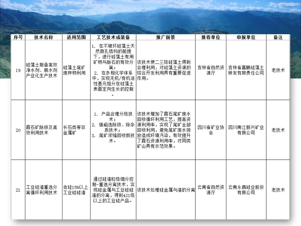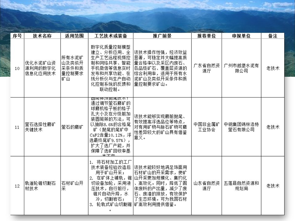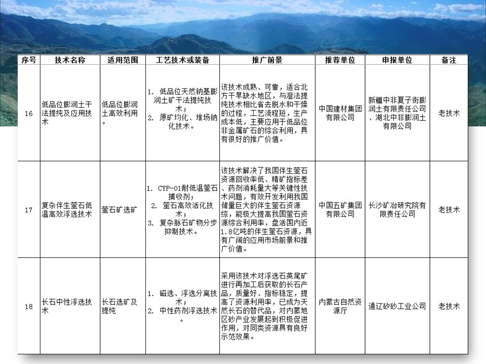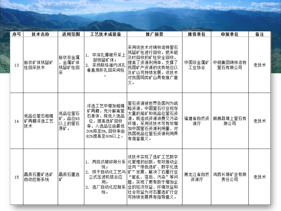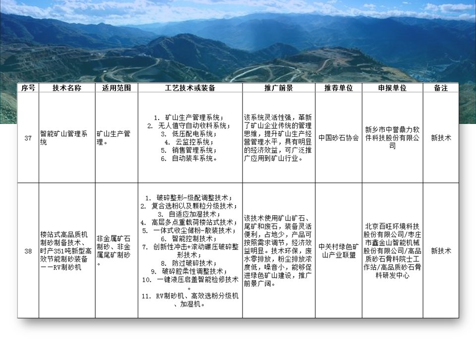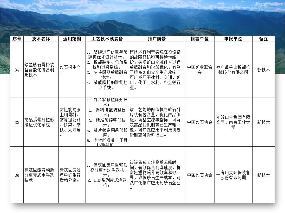其中入選的有“磁浮選”、“光選”等選礦工藝;也涉及石墨、螢石、硅藻土、長(zhǎng)石、石灰石、機(jī)制砂等材料的分離或提純工藝;也存在礦物廢渣回收利用技術(shù)以及礦區(qū)智能管理系統(tǒng)等新型技術(shù)。詳細(xì)目錄已經(jīng)經(jīng)過整理篩選,見下圖所示,不知道是否有你熟悉的技術(shù)或工藝嗎?