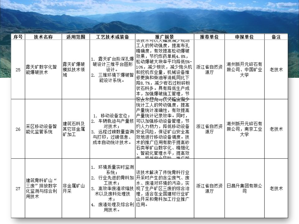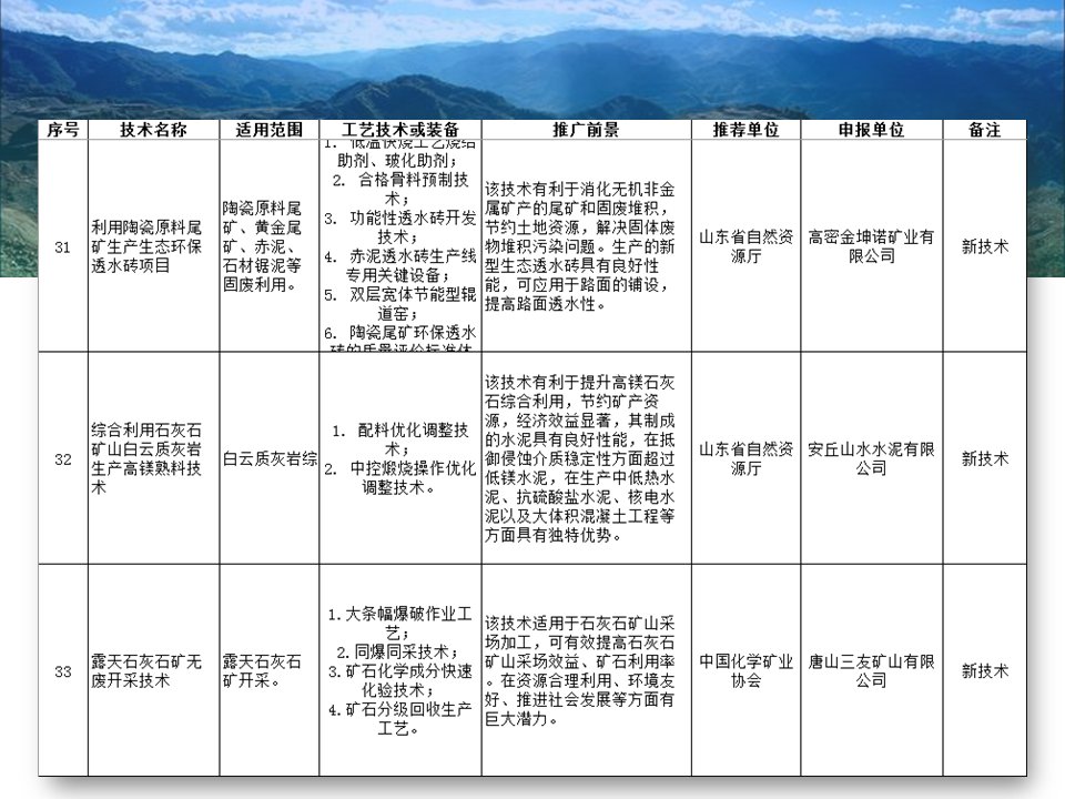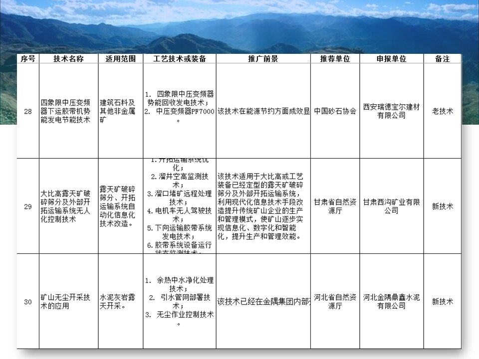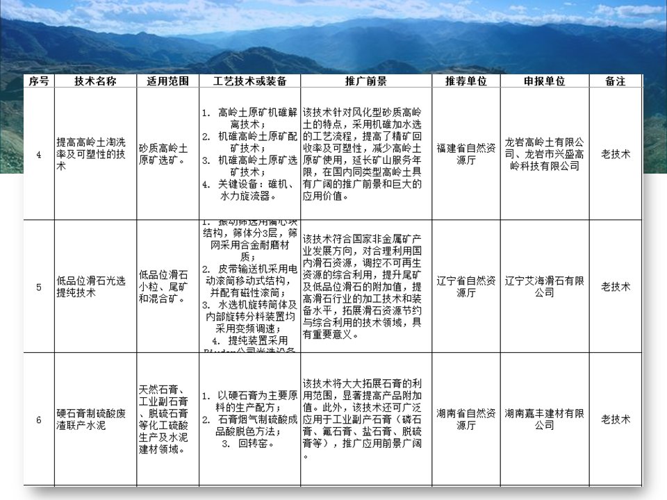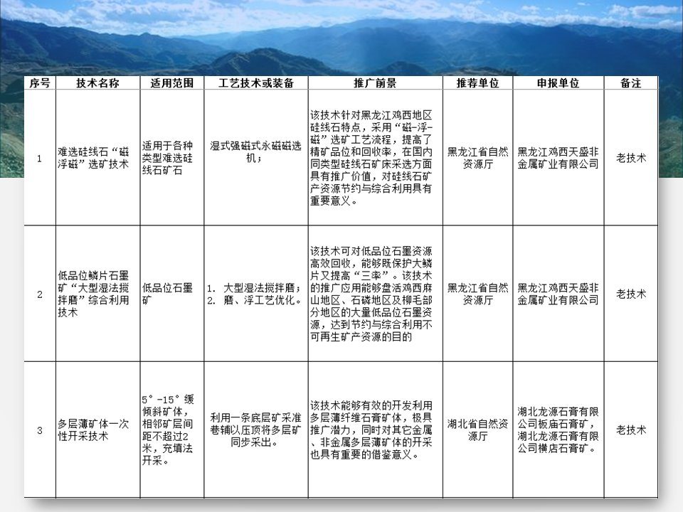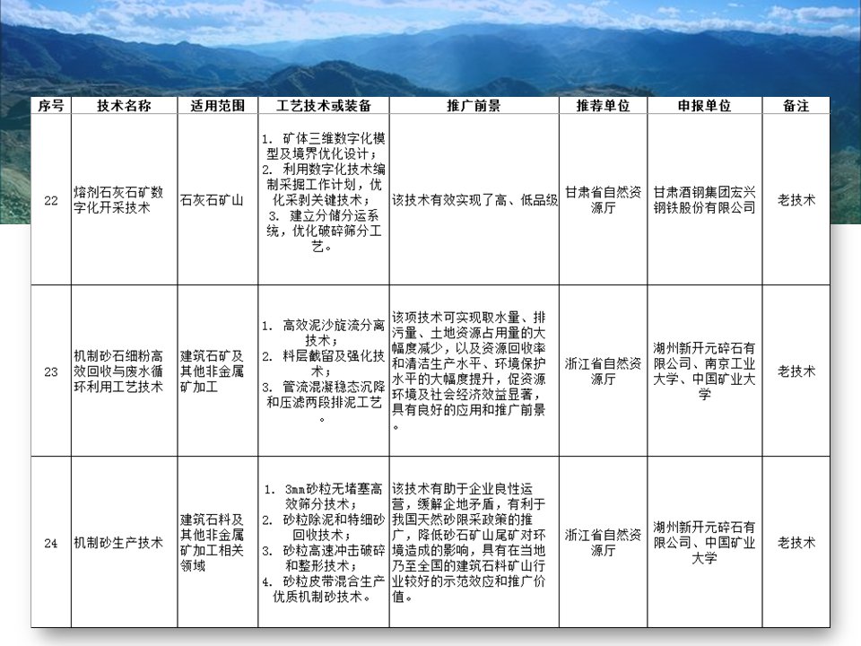 其中入選的有“磁浮選”、“光選”等選礦工藝;也涉及石墨、螢石、硅藻土、長(zhǎng)石、石灰石、機(jī)制砂等材料的分離或提純工藝;也存在礦物廢渣回收利用技術(shù)以及礦區(qū)智能管理系統(tǒng)等新型技術(shù)。詳細(xì)目錄已經(jīng)經(jīng)過整理篩選,見下圖所示,不知道是否有你熟悉的技術(shù)或工藝嗎?