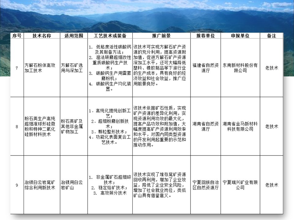 近日,自然資源部按照《自然資源部辦公廳關(guān)于開展礦產(chǎn)資源節(jié)約和綜合利用先進(jìn)適用技術(shù)目錄更新工作的通知》要求,經(jīng)對(duì)今年省級(jí)自然資源主管部門、中國(guó)地質(zhì)調(diào)查局、有關(guān)中央企業(yè)、有關(guān)行業(yè)協(xié)會(huì)及產(chǎn)業(yè)聯(lián)盟等新申請(qǐng)推薦的技術(shù)進(jìn)行遴選,并與前六批334項(xiàng)技術(shù)進(jìn)行綜合論證和篩選,最終優(yōu)選360項(xiàng)技術(shù),形成了《礦產(chǎn)資源節(jié)約和綜合利用先進(jìn)適用技術(shù)目錄(2019版)》,并進(jìn)行公示,其中非金屬類共38項(xiàng)技術(shù)入選。