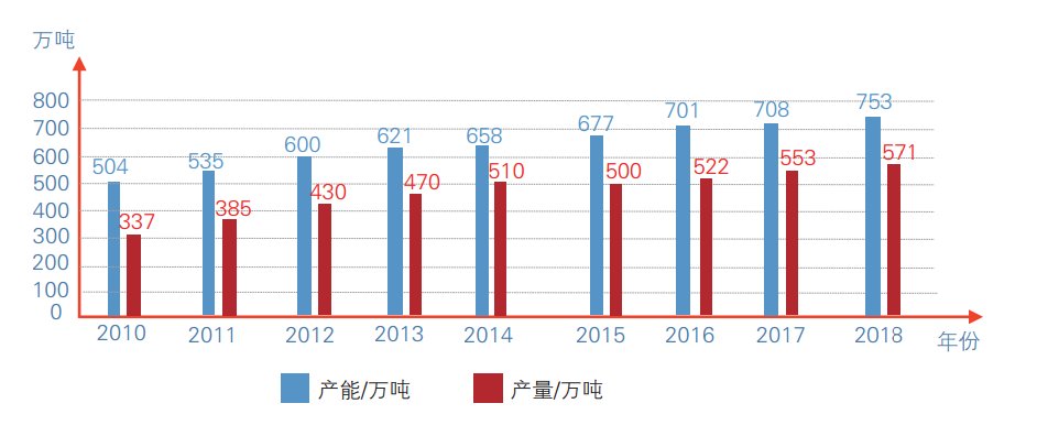 2010~2018年我國炭黑產能、產量情況