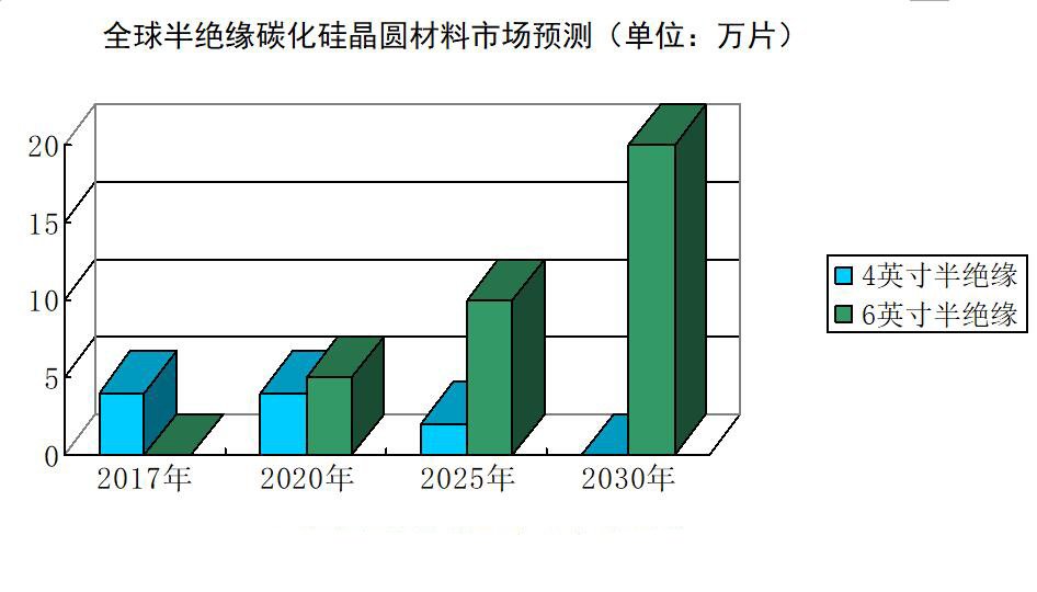 導(dǎo)通型碳化硅單晶襯底材料是制造碳化硅功率半導(dǎo)體器件的基材。根據(jù)Yolo公司統(tǒng)計,2017年4英寸碳化硅晶圓市場接近10萬片;6英寸碳化硅晶圓供貨約1.5萬片;預(yù)計到2020年,4英寸碳化硅晶圓的市場需求保持在10萬片左右,單價將降低25%,6英寸碳化硅晶圓的市場需求將超過8萬片。