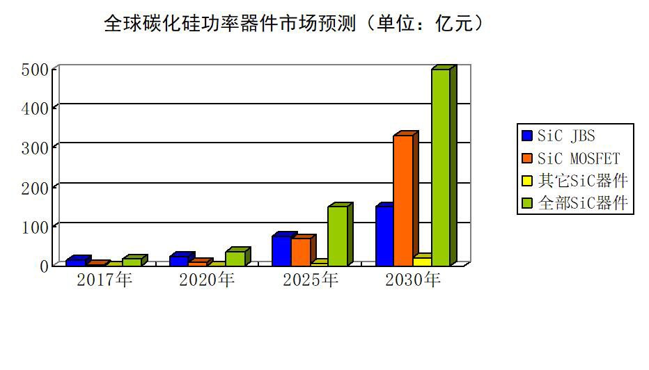 Yole公司預(yù)測,2017~2020年,碳化硅器件的復(fù)合年均增長率超過28%,到2020年市場規(guī)模達到35億元人民幣,并以超過40%的復(fù)合年均增長率繼續(xù)快速增長。預(yù)計到2025年,全球碳化硅功率器件市場規(guī)模將超過150億元人民幣,到2030年,全球碳化硅功率器件市場規(guī)模將超過500億元人民幣。
