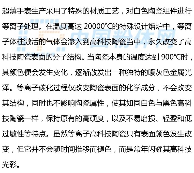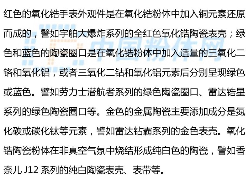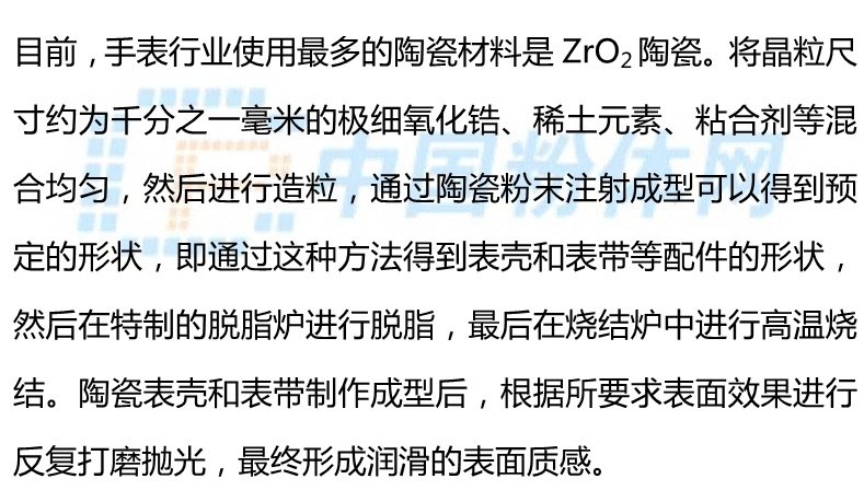 中國粉體網訊 傳統的手表多以不銹鋼、銅、貴金屬等材料為主,這些材料具有硬度低、耐磨性差等缺點,在佩戴過程中極易出現劃痕,從而影響手表的外觀效果。1962年,瑞士RADO公司首次發布了陶瓷手表Diastar,提出“永不磨損”的概念。自此,陶瓷材料以其獨特的優勢,在手表材料中逐漸發展壯大。