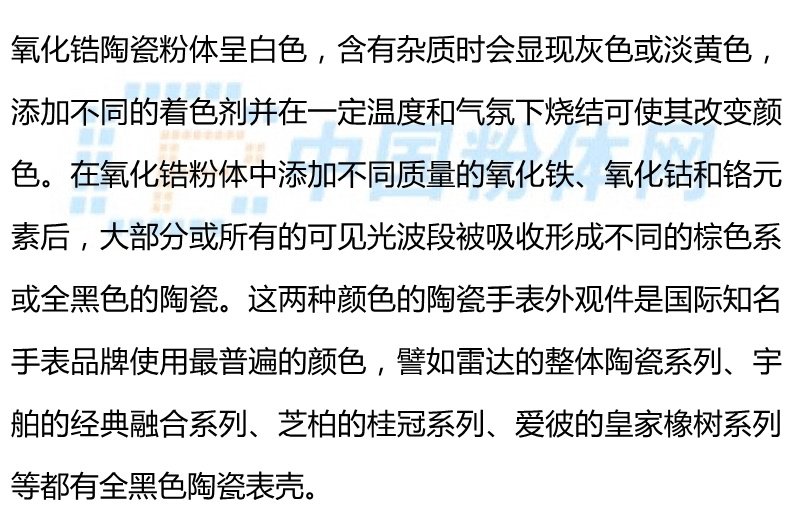 在陶瓷粉末原料中添加金屬氧化物作為著色劑,在一定溫度和氣氛中燒結后可形成具有不同顏色的彩色陶瓷材料。基于陶瓷著色劑制備方法和技術的不斷進步,彩色陶瓷的色彩越來越豐富,為陶瓷手表外觀件的多色彩提供了基礎材料技術支持。
