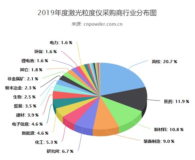 分析2019年激光粒度儀采購商行業分布圖,不難發現,行業分布最高的是高校,占比達到20.7%,說明高校研究對激光粒度儀的需求很大。緊隨其后的分別是醫藥、新材料、裝備制造,這四個行業總占比達到52.4%。另外,研究所、化工、新能源、電子信息等行業也是非常有發展潛力的行業,未來對激光粒度儀的需求也是激光粒度儀廠商應該密切關注的新的業務增長點。