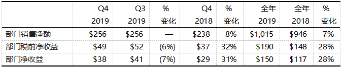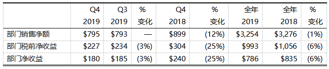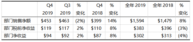 特殊材料部2019年全年銷售額符合預期。得益于創(chuàng)新產(chǎn)品的研發(fā)以及市場對高端玻璃的強勁需求,其全年銷售額同比增長8%。第四季度銷售額為4.53億美元,與2018年第四季度相比增長14%。