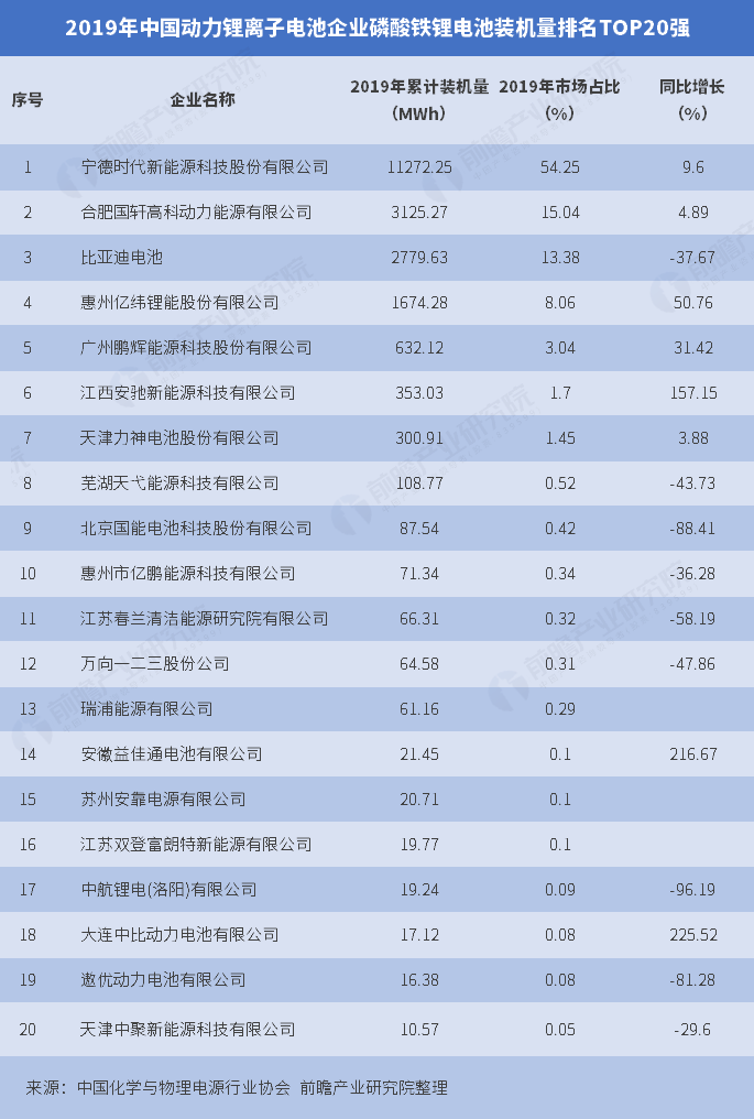 中國粉體網訊  根據中國化學與物理電源行業協會動力電池應用分會的統計分析,2019年我國新能源汽車共有配套動力鋰離子電池企業79家,相較2018年減少了13家,動力電池行業洗牌進一步加劇。下面一起來看一下2019年中國動力鋰離子電池企業磷酸鐵鋰電池裝機量排名TOP20強。