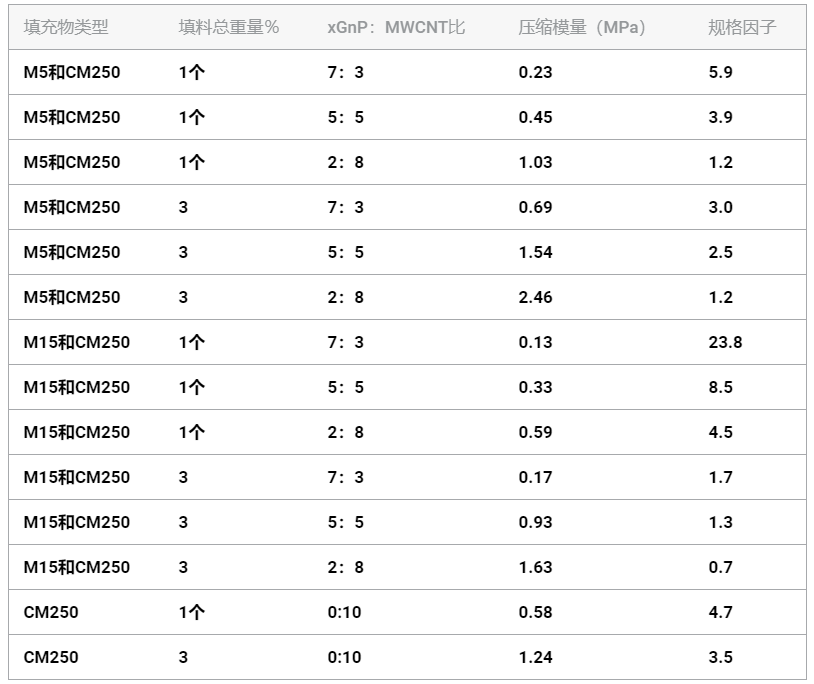 4)納米復合材料的壓縮模量隨xGnP:MWCNT比的降低而增加。隨著xGnP:MWCNT比的增加,納米復合材料的尺寸因數增加,xGnP:MWCNT的比率和納米填料的質量分數影響納米復合材料在壓縮下的壓縮模量和敏感性。MWCNT比率與納米填料的尺寸和質量分數無關。