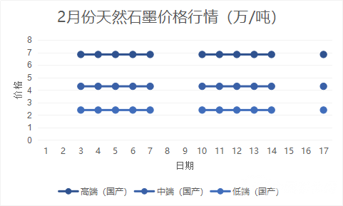 2月份上半月天然石墨價(jià)格維持穩(wěn)定,市場價(jià)格無大幅度變化,高端(國產(chǎn))天然石墨市場均價(jià)為6.85萬/噸,中端(國產(chǎn))天然石墨市場均價(jià)為4.萬/噸,低端天然石墨市場均價(jià)為2.4萬/噸。