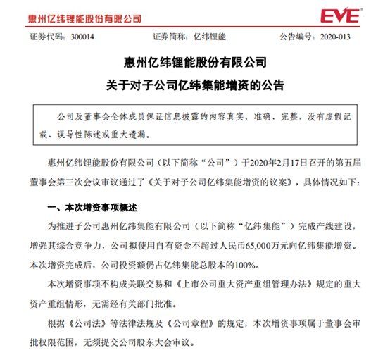 中國粉體網(wǎng)訊 為推進子公司惠州億緯集能有限公司完成產(chǎn)線建設(shè),增強其綜合競爭力,億緯鋰能擬使用自有資金不超過人民幣65000萬元向億緯集能增資。