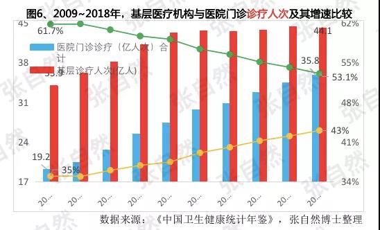 2019年,國家衛建委也制定了醫聯體等旨在實施分級診療的系列政策,可見基層醫療的作用非常重要,但實際情況不容樂觀,如圖6所示,醫院門診的診療人次由2009年的19.2億人次提到了2018年的35.8億人才,占比也由2009年的35%提高到了2018年的43%,增加了8個百分點,而基層醫療機構的診療人次雖也由2009年的33.9億人次提搞到了44.1億人才,但占比卻由2009年的61.7%下降到了2018年的53.1,反而下降了8.6個百分點。