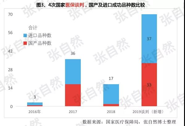 3、2019醫保目錄調整和國家醫保談判新增加了很多品種進入醫保目錄,其中,國談就新增了70個,比之前的3次國談新增總數的56個還多(圖3),且不乏單支達4000多元的貴藥。