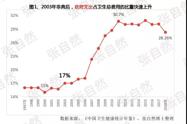 2月14日,中央全面深改委第十二次會議提出,“完善重大疫情防控體制機制,健全國家公共衛生應急管理體系“的15個體系、9種體制、4項制度都將增加政府向醫療衛生領域的投入,實際上,自2003年非典之后,國家就加大了對醫療衛生的投入,政府支出占衛生總費用的比重由2003的17%迅速提升到了2011年的30.5%,增加了將近一倍,2018年占比仍高達28.26%(圖1)。