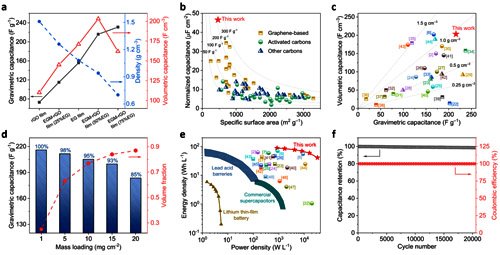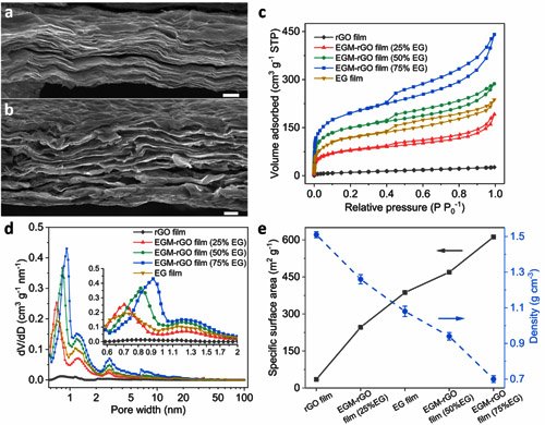 中國粉體網(wǎng)訊 電化學電容器具有可快速充電、功率高、循環(huán)壽命長、工作溫度范圍寬、安全性能高等優(yōu)點,可用作大功率電源,在混合電動汽車、備用電源、便攜式電子設備等領域都具有廣闊的發(fā)展前景。然而電化學電容器相比于電池其能量密度較低,即單位體積內(nèi)儲存的能量低,限制了其更廣泛的應用范圍,尤其是在便攜式智能設備中的應用, 需要進一步提高體積能量密度。近日,中國科學院金屬研究所與英國倫敦大學學院合作,在《自然-能源》(Nature Energy) 在線發(fā)表題為《可調層間距、高效孔利用石墨烯薄膜的電化學電容儲能研究》(Tuning the interlayer spacing of graphene laminate films for efficient pore-utilization towards compact capacitive energy storage)的研究論文。