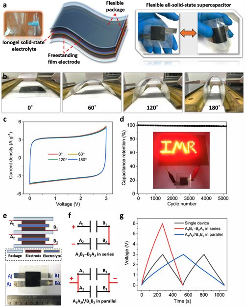 研究人員制備了不同比例的氧化石墨烯和熱膨脹還原石墨烯的混合溶液,經(jīng)過真空抽濾,得到片層間距可調節(jié)的復合石墨烯基薄膜。通過調控片層間距,實現(xiàn)了優(yōu)化整個電極材料孔隙率的效果。當電極材料的孔隙尺寸與電解液的離子尺寸相匹配時,孔隙的空間利用達到了最優(yōu)化,從而極大化了體積能量密度。在此基礎上,科研人員設計了全固態(tài)柔性電化學電容器,石墨烯薄膜電極材料本身良好的彎折性能,保證了整個器件的柔性,并進一步發(fā)展了智能器件,通過根據(jù)實際需求改變電路連接方式,實現(xiàn)了不同的輸出效果。