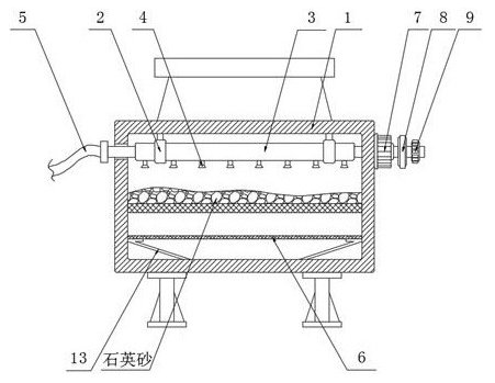 摘要:本發明公開了一種基于破碎石英砂用的除塵設備,包括破碎機本體,所述破碎機本體的頂部內表壁通過導向環安裝有噴淋箱,所述噴淋箱的下端面設置有霧化噴頭,所述噴淋箱的另一端通過轉軸套接有齒輪盤,所述齒輪盤的前端固定安裝有驅動電機,所述驅動電機的輸出軸依次套接有第一轉輪和第一半齒盤。本發明中,利用第一轉輪通過皮帶帶動第二半齒盤轉動,第二轉輪的轉動帶動第二半齒盤轉動,第一半齒盤和第二半齒盤均與齒輪盤嚙合連接,從而使得半齒盤進行反方向交替轉動,半齒盤的轉動通過轉軸帶動噴淋箱進行反方向交替轉動,使得噴淋范圍擴大,提高了噴淋除塵裝置的除塵效果。