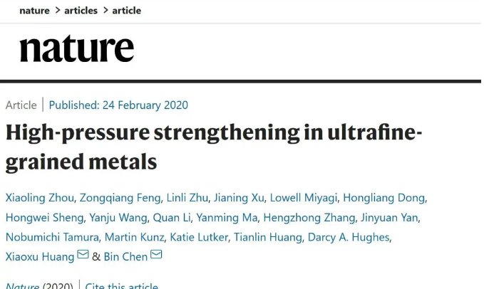 中國粉體網訊 近日,重慶大學材料學院黃曉旭教授團隊與北京高壓科學研究中心陳斌研究員團隊等合作,在《Nature》上發表題為“High pressure strengthening in ultrafine-grained metals(超細晶金屬的高壓強化)”的研究成果,黃曉旭教授為共同通訊作者,重慶大學為共同通訊單位,材料學院青年教師馮宗強為共同第一作者,黃天林副教授為共同作者。該研究成果是重慶大學在材料科學領域,繼2019年7月作為通訊單位在《Science》上發表研究成果之后的又一重要進展。