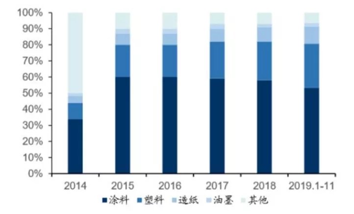 鈦白粉主要用于涂料(建筑涂料和工業涂料)、塑料、造紙和油墨等領域。其中涂料是第一大需求,2019年占比達到53.3%,涂料用量和下游房地產在建面積關系最為緊密。近些年來國內涂料需求占比緩慢下降,塑料需求占比逐步提升,鈦白粉消費結構逐漸向著國外靠近。鈦白粉在涂料中不僅是遮蓋和裝飾,更重要的是改善涂料的物化性能,增強化學穩定性,以至提高遮蓋力、消色力、防腐蝕、耐光、耐候性等,因此不僅是白色涂料會添加鈦白粉,所有顏色的涂料都要添加鈦白粉。