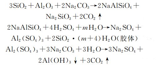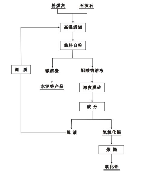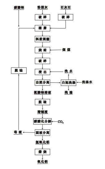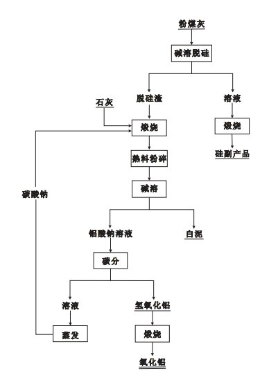 工藝過程:高鋁粉煤灰與純堿按比例混合后中溫燒結,燒結熟料浸入稀鹽酸或硫酸中轉化為硅膠沉淀和含鋁溶液[AlCl3或Al2(SO4)3],過濾所得硅膠可生產白炭黑、氧化硅氣凝膠、多孔氧化硅等化合物;濾液經苛化、除雜、碳分或種分制備氫氧化鋁,經煅燒制得氧化鋁。