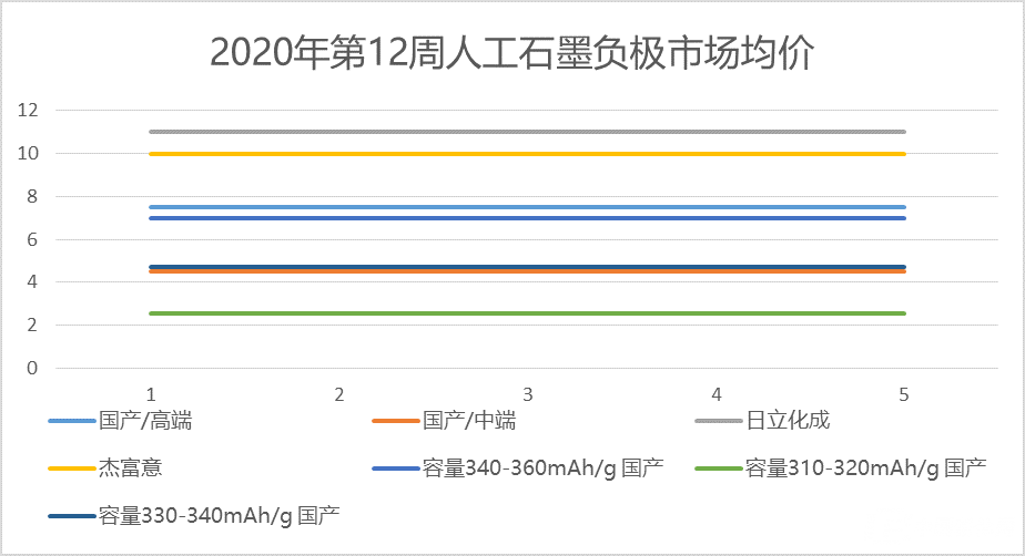 第12周人造石墨負極均價與上周相比,除國產中端人工石墨有所調整外,其余產品類基本與上周持平,具體均價:高端(國產)7.5萬/噸,中端(國產)4.5萬/噸,日立化成11萬/噸,杰富意10萬/噸,容量310-320mAh/g(國產)2.55萬/噸,容量330-340mAh/g(國產)4.7萬/噸,容量340-360mAh/g(國產)7萬/噸。