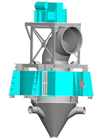 選粉機出風彎管接收塵器的進風口 ,由于收塵器風機的抽風作用 ,空氣經選粉機一 、二次風口吸入選粉渦流殼內 ,在導風葉的導流 、轉子的旋轉和固定緩沖板的作用下 , 在導風葉和轉子之間形成穩定的環形水平渦流選粉區 。粉磨后的物料從選粉機進料口喂入 ,通過旋轉的撒料盤均勻撒向四周 ,因擋料圈的阻擋作用 ,物料在分散狀態下撒落在導風葉和轉子之間的選粉區 。在選粉渦流中運動的粉塵顆粒將同時受重力、風力和旋轉離心力的作用 ,細小輕微的顆粒隨氣流被吸入轉子內部 , 經出風口由收塵器收集成為成品;粗重顆粒則下落,最終被收集到下錐體的粗粉出口 ,返回到磨機再磨 , 從而形成閉路系統 。改變轉子轉速可有效調節成品細度。