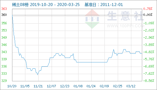 中國粉體網訊 3月24日稀土指數為342點,與昨日持平,較周期內最高點1000點(2011-12-06)下降了65.80%,較2015年09月13日最低點271點上漲了26.20%。(注:周期指2011-12-01至今)。