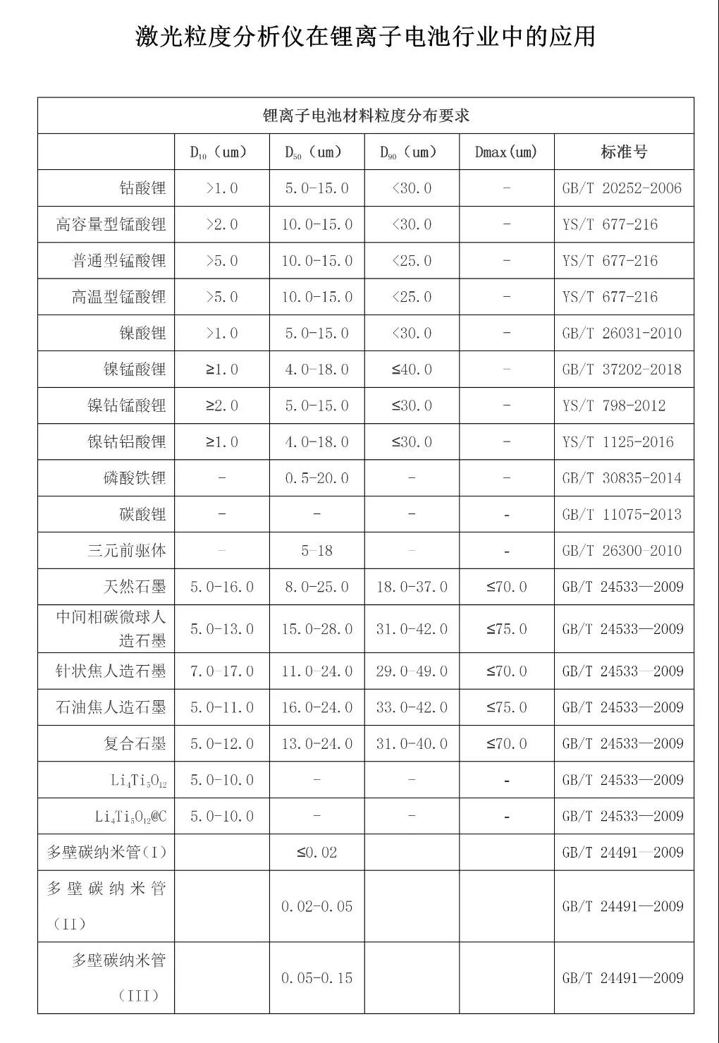 鋰離子電池產業作為我國“十二五”和“十三五”期間重點發展的新材料、新能源、新能源汽車三大產業中的交叉產業,國家出臺了一系列支持鋰離子電池產業發展的支持政策,直接帶動了我國鋰離子電池行業的持續高速增長。為了規范鋰離子電池行業的健康穩健發展,國家相關部門先后制訂了涉及到鋰離子電池全產業鏈的相關行業標準,而相關電池材料的粒度分布檢測就是其中一項重要檢測指標。下面,我們看一看這些行業標準對粒度分布的相關規定。