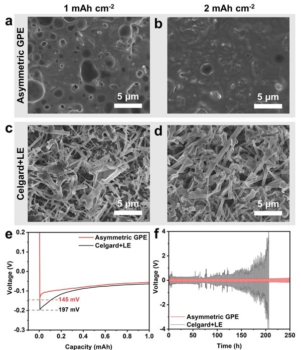 圖5. 電解質(zhì)對(duì)金屬鋰沉積的影響。(a-d)Asymmetric GPE與Celgard+LE在銅箔表面沉積鋰形貌SEM圖像,(e)金屬鋰的沉積電位,(f)Li|Li對(duì)稱(chēng)電池循環(huán)過(guò)電位。