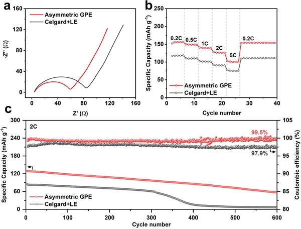 圖6. Li|LFP電池測(cè)試。Asymmetric GPE與Celgard+LE的(a)電池阻抗測(cè)試,(b)倍率性能,(c)長(zhǎng)循環(huán)性能與庫(kù)倫效率。