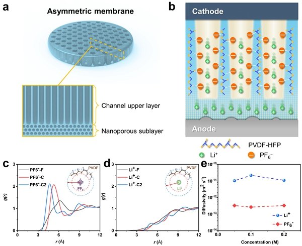 圖1.(a)不對(duì)稱(chēng)結(jié)構(gòu)Asymmetric GPE以及(b)離子傳輸示意圖。計(jì)算模擬(c)PF6-和(d)Li+與PVDF的徑向分布函數(shù),(e)離子在PVDF中擴(kuò)散系數(shù)。