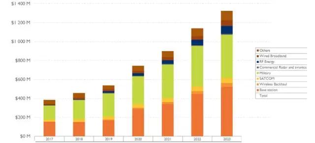 全球每年新建約150萬座基站,未來5G網絡還將補充覆蓋區域更小、分布更加密集的微基站,對GaN器件的需求量將大幅增加。此外,國防市場在過去幾十年里一直是氮化鎵開發的主要驅動力,目前已用于新一代空中和地面雷達。
