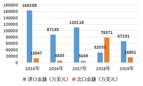2019年我國氧化鋁進口金額為67291萬美元,出口金額為16801萬美元。