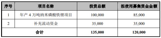 德方納米募集資金投向(單位:萬元)