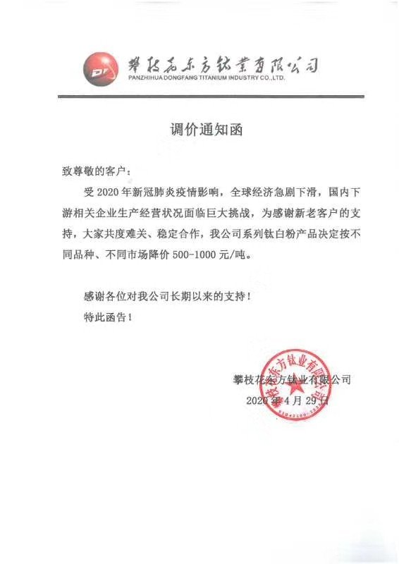 截止成稿日,最新降價(jià)消息來自東方鈦業(yè)于4月29日發(fā)布的調(diào)價(jià)函,其鈦白粉產(chǎn)品決定按不同品種,不同市場(chǎng)降價(jià)500-1000元/噸。