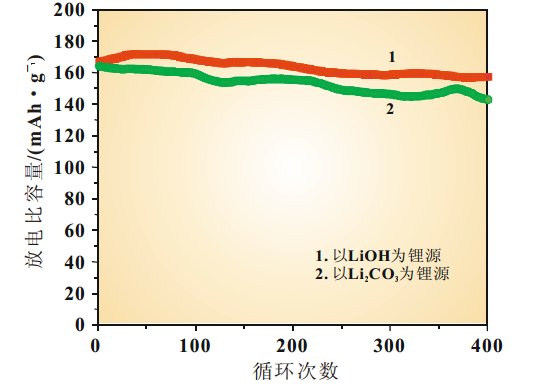 根據汪永斌等的實驗結果表明:采用碳酸鋰制備的三元材料,首次放電比容量達到165mAh/g,400次循環,容量保持率達到86%左右,而采用氫氧化鋰所制備的三元材料,首次放電比容量達到171mAh/g,400次循環,容量保持率達到91%。從整個循環過程來看,以氫氧化鋰為鋰源的材料循環曲線更為平滑穩定;以碳酸鋰為鋰源的材料約350次循環后容量衰減逐漸加快。