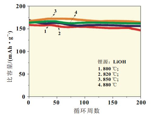 研究表明以氫氧化鋰為鋰源時,只需低溫燒結就可以得到性能優異的材料;而以碳酸鋰為鋰源時,燒結溫度要達到900℃以上,才能得到性能穩定的材料。隨著循環次數增加,以氫氧化鋰為鋰源所制備的材料循環曲線更加平滑,充放電性能更加穩定。