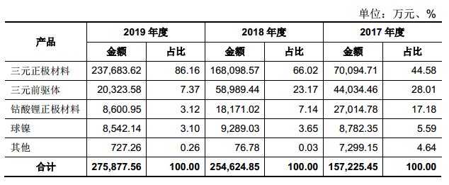 2017 年、 2018 年和 2019 年,公司主營業務毛利率分別為 20.98%、 15.17%和17.14%,呈現波動趨勢。公司主要業務收入集中在三元正極材料和三元前驅體,兩者占比達72.59%。