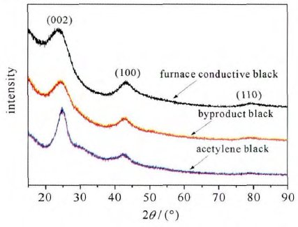 根據(jù)乙炔炭黑、副產(chǎn)炭黑和爐法導(dǎo)電炭黑三種導(dǎo)電炭黑的 XRD圖譜可知,三種導(dǎo)電炭黑衍射峰均較寬,微晶呈“亂層結(jié)構(gòu)”。其中,副產(chǎn)炭黑和爐法導(dǎo)電炭黑的特征衍射峰(002)比乙炔炭黑的衍射峰更寬,非晶化程度較高。