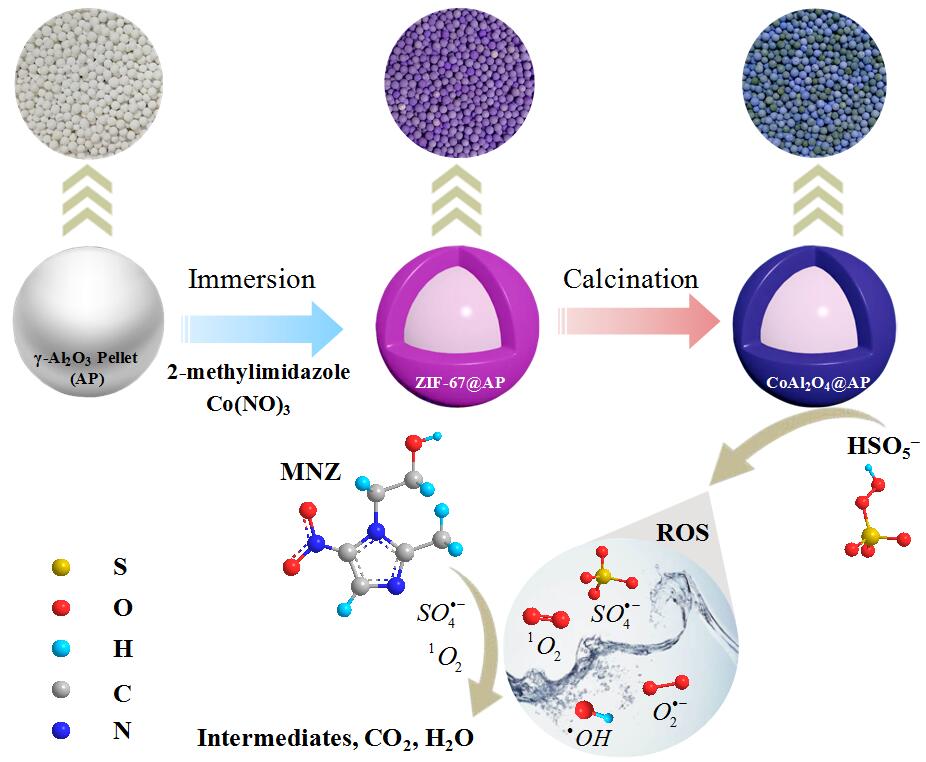 ZIF-67@γ-Al2O3微球衍生的界面CoAl2O4物種催化過一硫酸鹽去除甲硝唑機理圖