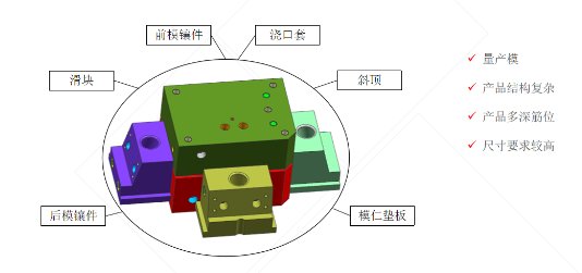 除此之外,模具中一些結構類型,如:斜頂、滑塊、澆口套、前模鑲件等,皆可采用3D打印技術,如圖4所示,小編已經把要素總結出來,保存這張圖,下次糾結要不要采用3D打印技術的時候,拿出此圖對照即可,拿走不謝~