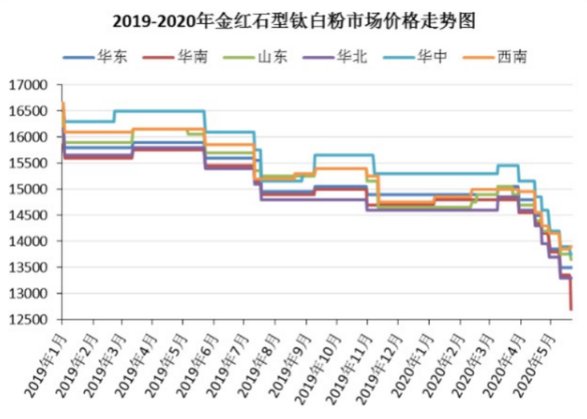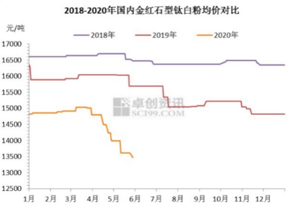 卓創資訊統計的數據顯示,進入二季度,國內鈦白粉噸價降幅近3000元,同前兩年相比,原本是全年景氣度最好的二季度,卻在今年受到重挫。