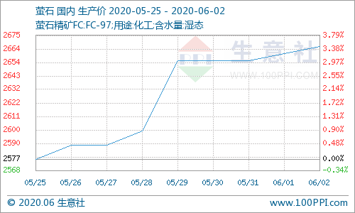 中國粉體網訊 據生意社監測顯示國內螢石價格上漲,自5月25日開始結束了2個月以來的下跌行情,螢石價格從5月25日2577.78元/噸上漲至6月2日的2666.67元/噸,漲幅為3.45%。