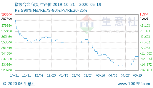 中國(guó)粉體網(wǎng)訊 近期國(guó)內(nèi)輕稀土市場(chǎng)價(jià)格觸底反彈,鐠釹氧化物及鐠釹合金價(jià)格連續(xù)走高,輕稀土市場(chǎng)迎來(lái)“春天”。根據(jù)生意社稀土板塊指數(shù)顯示,6月4日稀土指數(shù)為334點(diǎn),較昨日上升了1點(diǎn),較周期內(nèi)最高點(diǎn)1000點(diǎn)(2011-12-06)下降了66.60%,較2015年09月13日最低點(diǎn)271點(diǎn)上漲了23.25%。(注:周期指2011-12-01至今)。