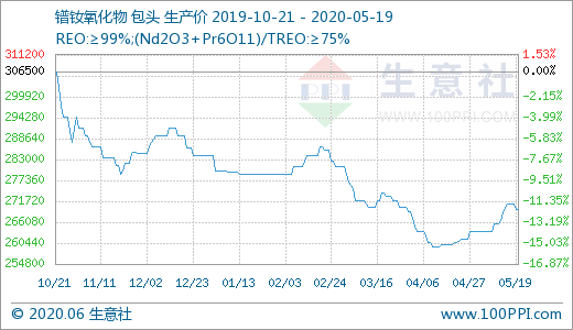 截止6月4日國(guó)內(nèi)稀土中鐠釹氧化物價(jià)格上漲1500元/噸至27.45萬(wàn)元/噸;鐠釹合金價(jià)格上漲3000元/噸至34.55萬(wàn)元/噸,氧化釹及金屬釹等均有不同程度的漲價(jià)。